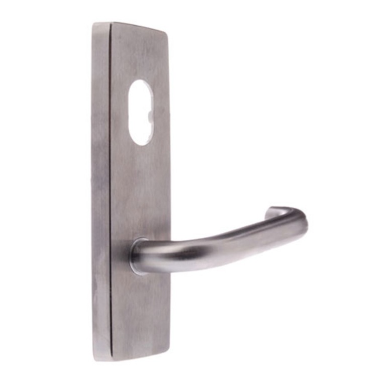 The plate includes a 70 series lever and a cylinder hole, allowing the door to be operated by lever from the inside while supporting keyed access through an external cylinder. This combination is commonly used in controlled entry and secure door systems.